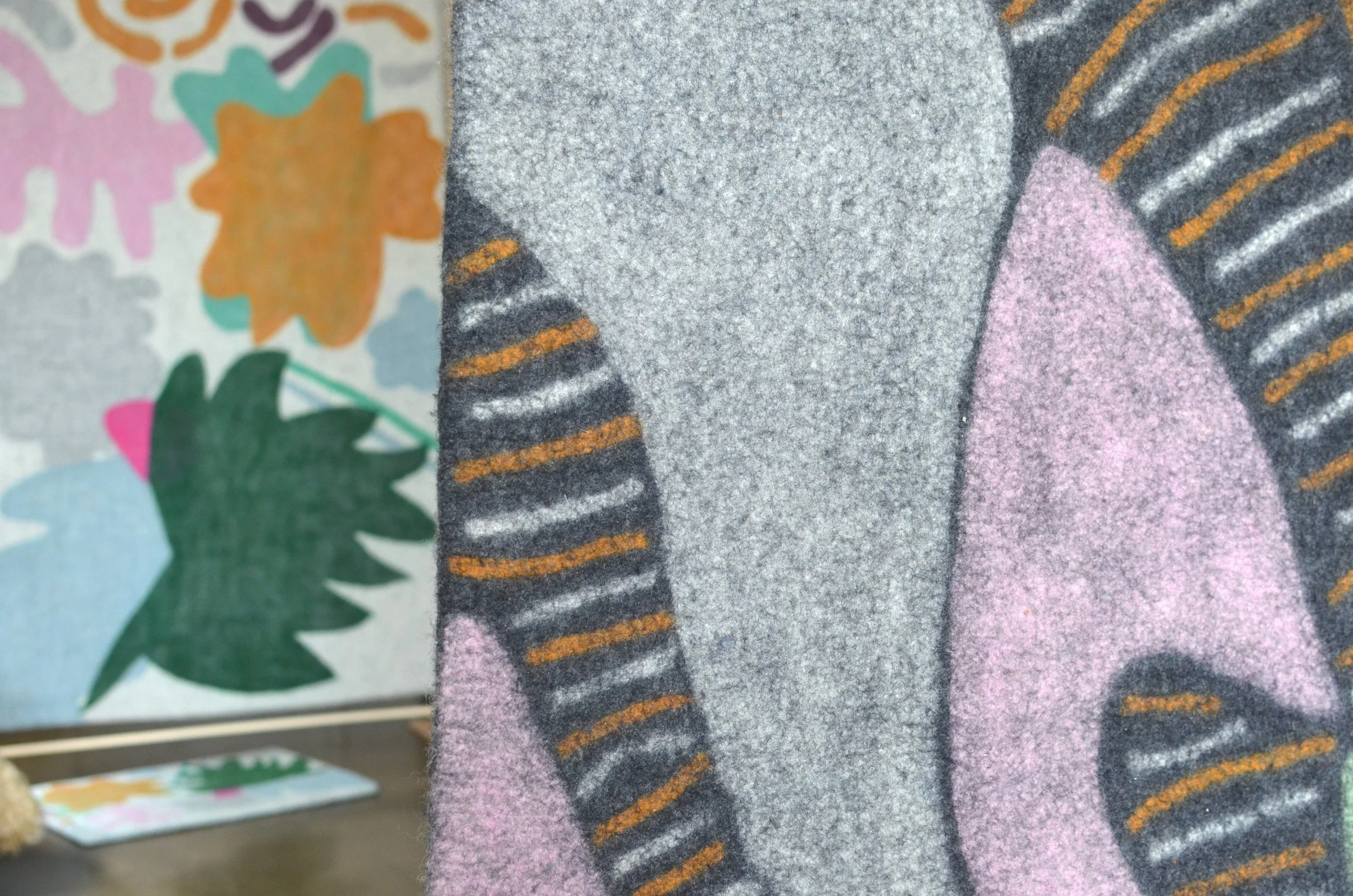 Wool felt rugs made by hand in Nepal. Fair Trade Certified. This unique and rare project is a renewal of Melina’s legacy felt rug collections that began in 2002 in Iran and is undergoing revitalization with new felt making partners in Nepal. Custom sizes and colors are now available. Our felt artisan partners were trained by Melina Finkelstein during a residency in April 2024 when she taught the women artisans the techniques for making Peace Industry ® felt rugs.
